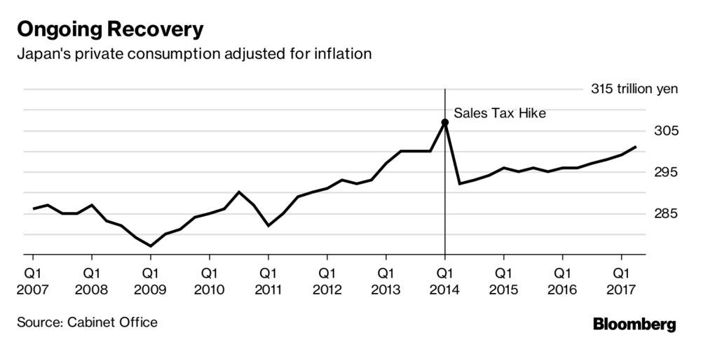 Japan’s private consumption and business spending hit the highest levels since the first quarter of 2014, before a sales-tax increase in April of that year sent the economy into a long slump.