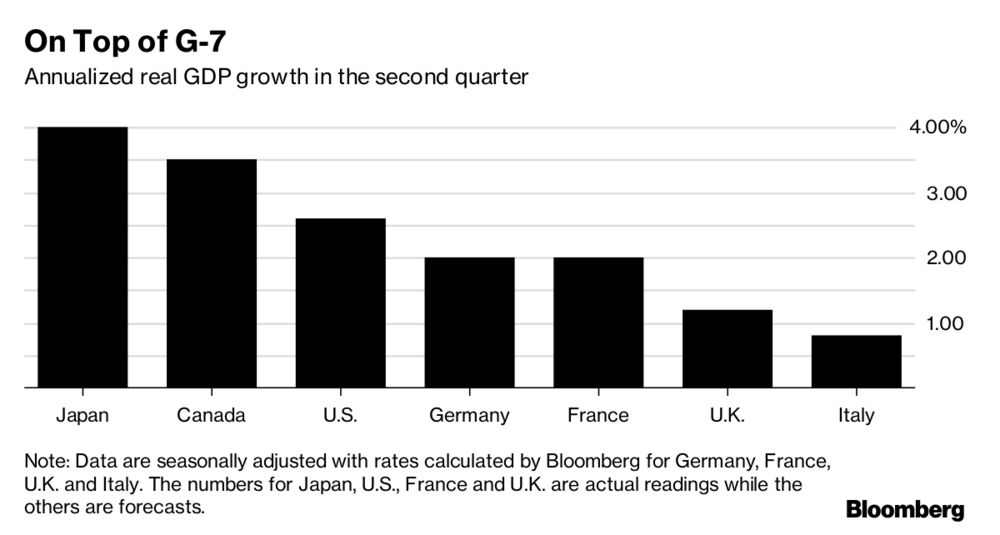Japan’s second-quarter gross domestic product data put the nation in an unexpected spot: at the top of the growth table among Group of Seven advanced economies.